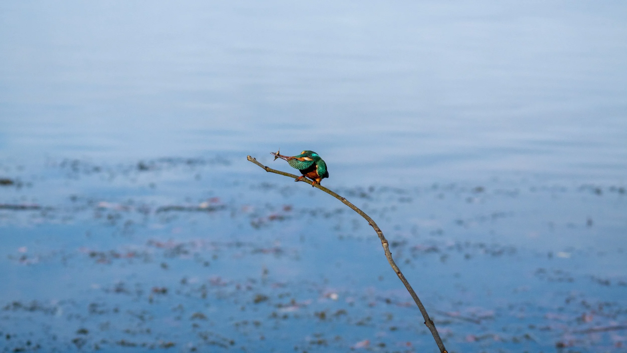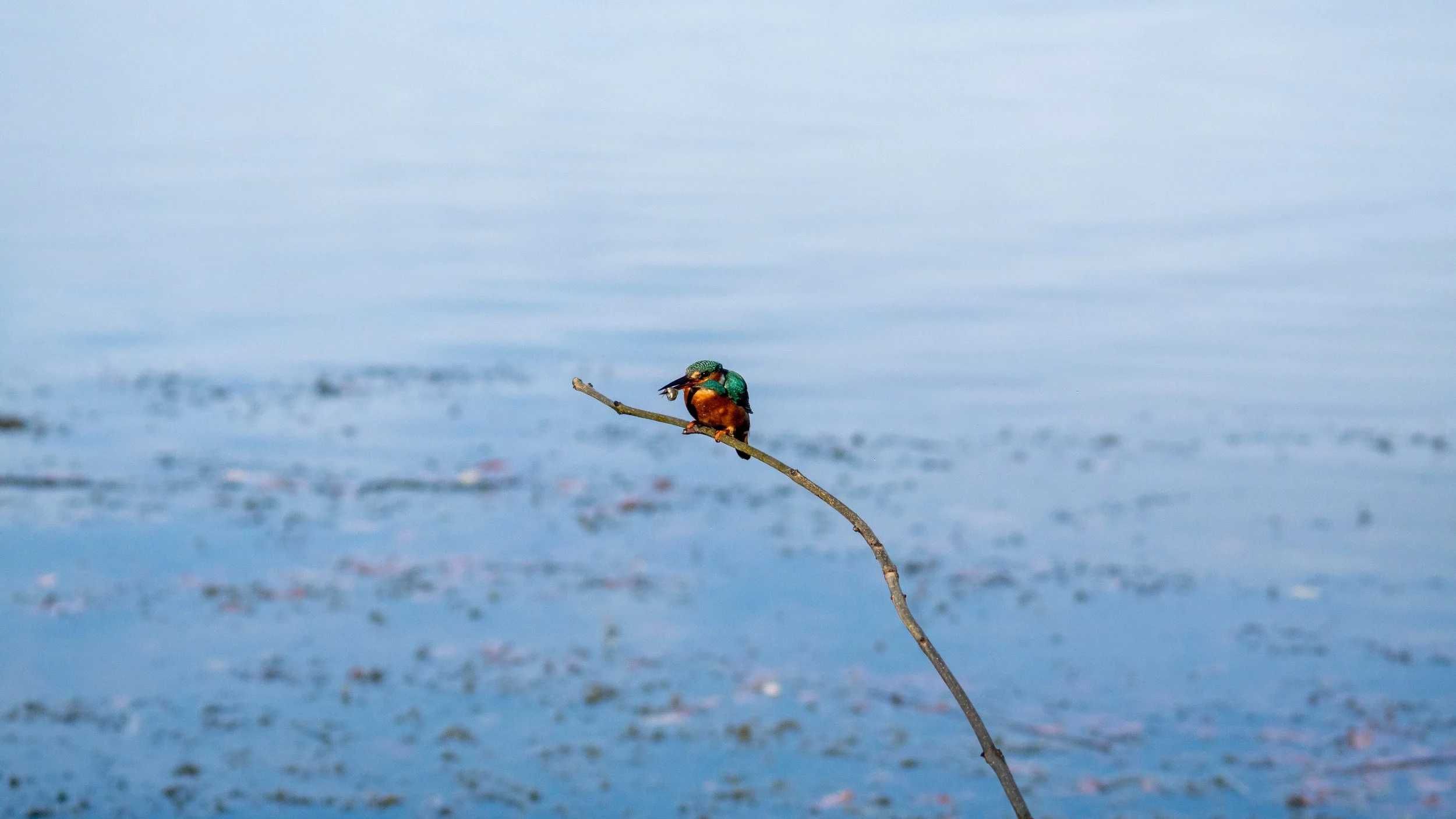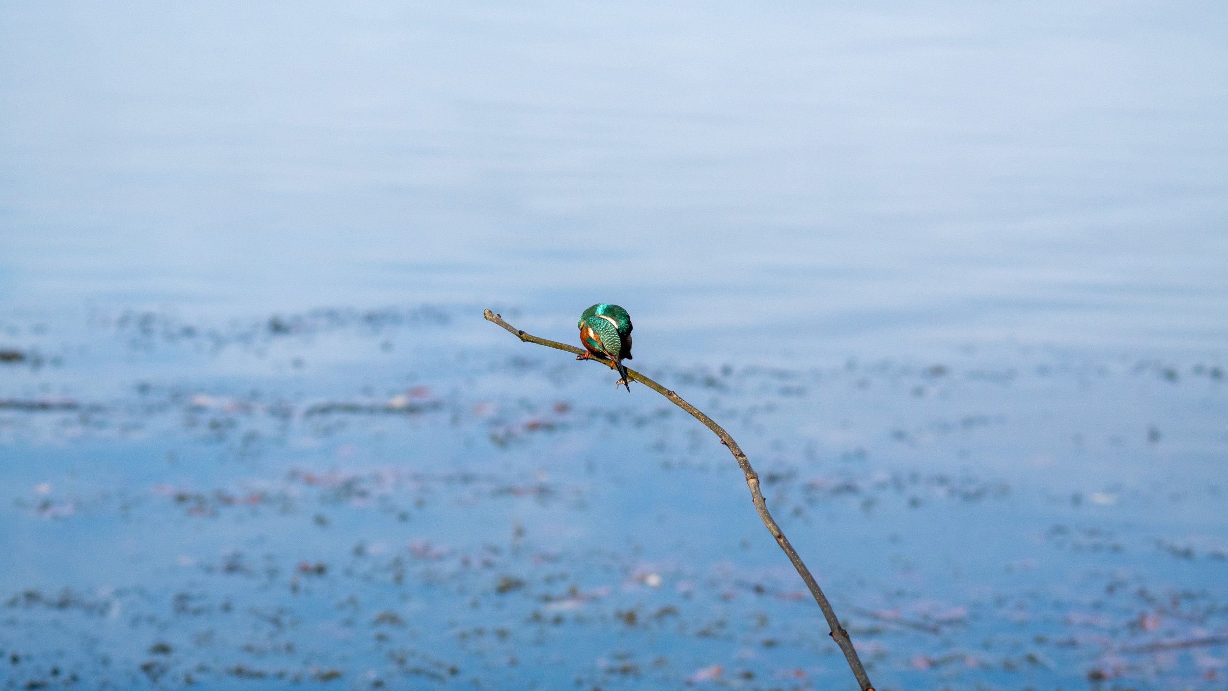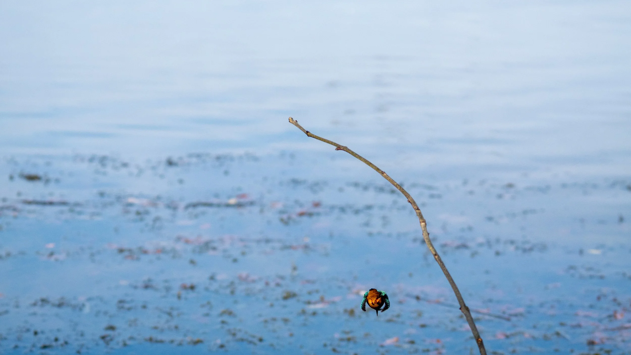 Then, suddenly, I spotted the back of a kingfisher on a distant tree. Adrenaline rushed through me, but I needed to stay calm and quiet, hoping the kingfisher would come to the perches I’d set up.